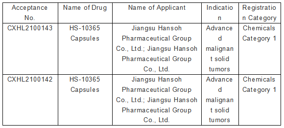 Recently, Jiangsu Hansoh Pharmaceutical Group Co., Ltd. ("Hansoh Pharma" or "Company") received the Notice of Approval for Clinical Trial of Drug from the National Medical Products Administration ("NMPA"), according to which the Company is approved to carry out clinical trial of HS-10365 Capsules, a Class 1 innovative drug with independent intellectual property rights, for advanced malignant solid tumors.