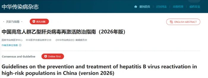 [1]国家传染病医学中心,中华医学会感染病学分会,《中华传染病杂志》编辑委员会. 中国高危人群乙型肝炎病毒再激活防治指南(2026年版)[J]. 中华传染病杂志,2025, 网络预发表.DOI:10.3760/cma.j.cn311365-20251118-00397